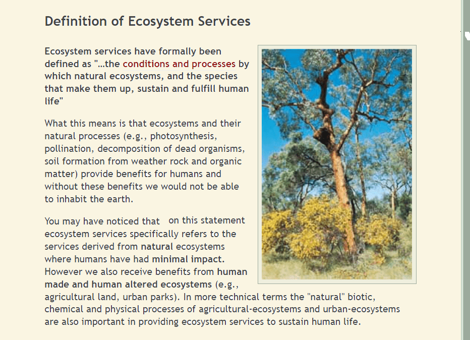 - Charles Darwin University, Faculty of Science and Technology, ‘Ecosystem Services concept EV205’ http://learnline.cdu.edu.au/units/env205/module1/eco.html