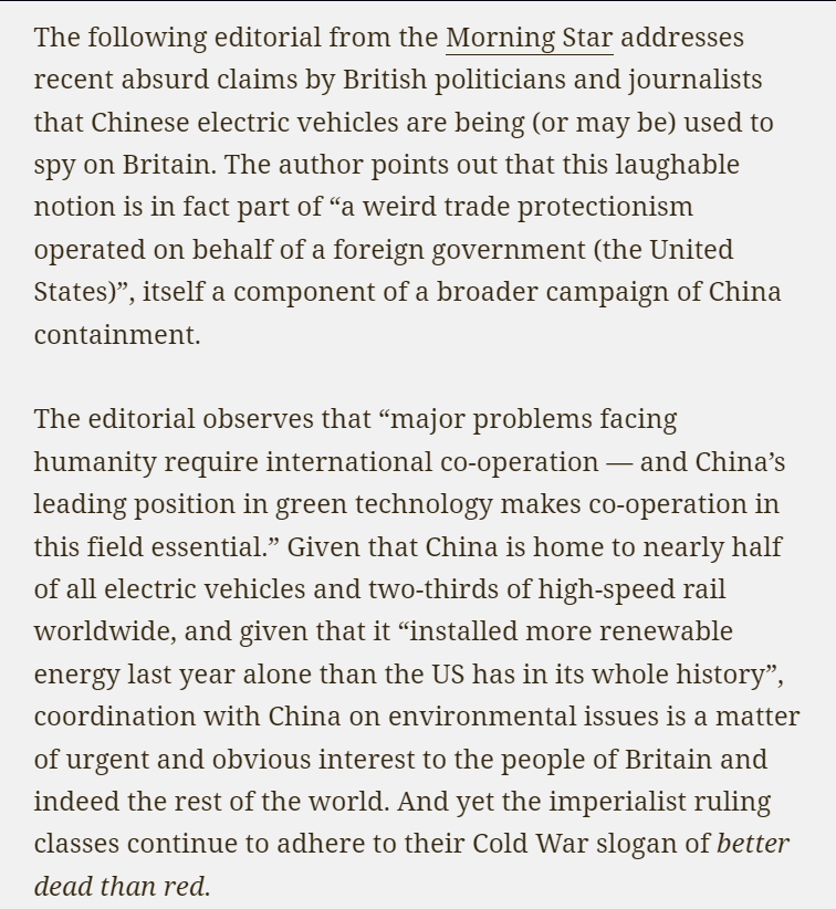 Although the editorial deals with the current hysteria in the UK political establishment over “spying” by Chinese made electric vehicles, most of the commentary is equally applicable to most other Anglo-American media. The newspaper has been a strong supporter of China’s building its unique path to socialism.