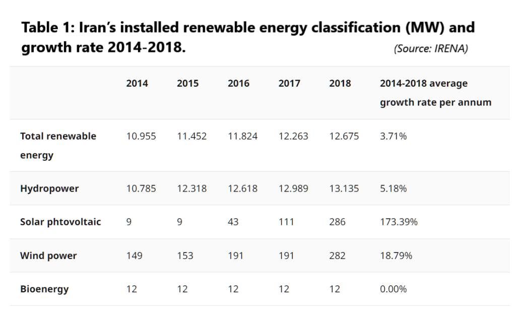 Note: Data in the above report was compiled in 2020. In October 2020 Iran’s Renewable Energy and Energy Efficiency Organization (SATBA) announced that by March 2021, 28 new renewable power plants would be inaugurated across Iran.