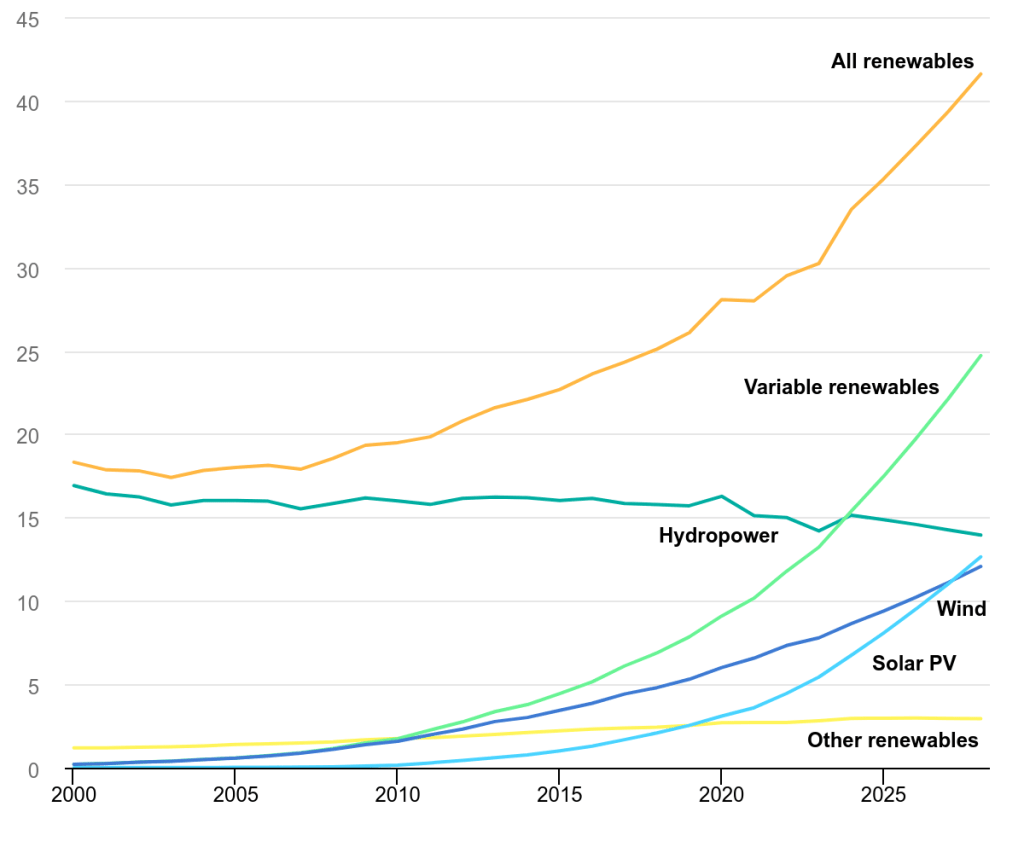 - In 2028, renewable energy sources account for over 42% of global electricity generation, with the share of wind and solar PV doubling to 25%.