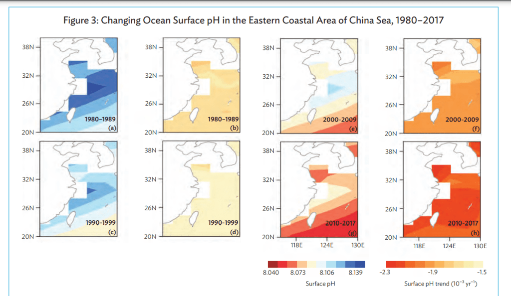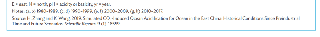Increasing ocean acidification is documented in all of the PRC’s seas. For example, since 1999, the seawater pH values in the coastal sea of South China have significantly reduced, with an annual average decrease rate of about 0.012−0.014.10 Ocean acidification is particularly evident in the coastal sea of South China—compared to preindustrial times, the ocean’s surface pH declined from 8.20 to 8.06 in 2017, equivalent to a 35% increase in acidity (Figure 3).