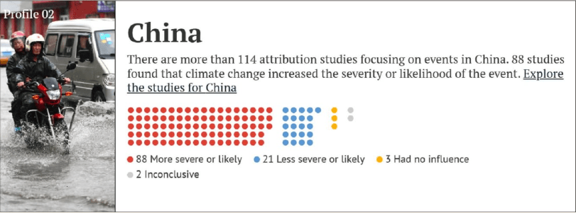 There are more than 114 attribution studies focusing on events in China. 88 studies found that climate change increased the severity or likelihood of the event.