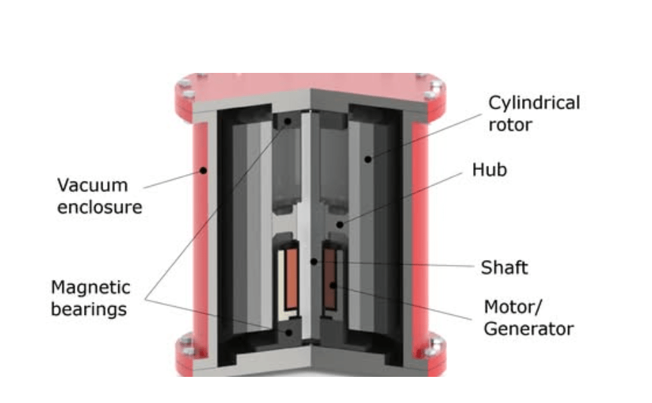 The rotating mass is supported by magnetic bearings which operate in a vacuum to eliminate frictional losses during long-term storage and safety issues [55]. The rotor bearing system can be mechanical or magnetic or a hybrid system of both to take advantage of the strengths of each type.