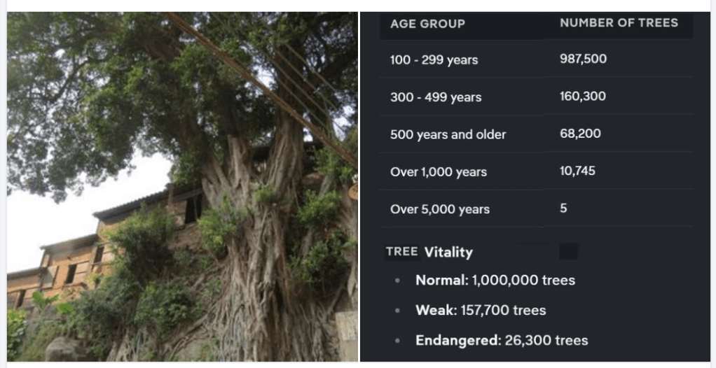 A national survey conducted from 2015 to 2021 identified approximately 5.08 million ancient and notable trees in China.